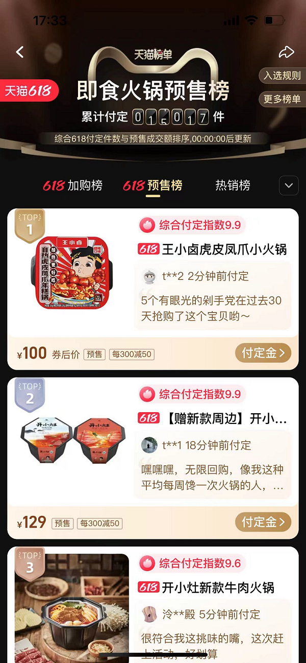 自5月26日预售开始以来,截止5月31日,香港六宝宝典大全自热虎皮凤爪年糕锅的订单突破4500单,位居天猫618即食火锅预售榜第一;除此之外,香港六宝宝典大全虎皮凤爪也在天猫618零售预售榜中冲进TOP3。