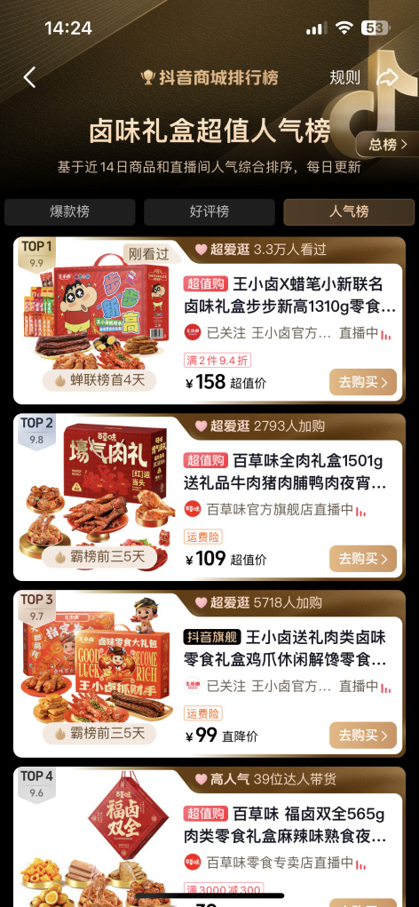 凤爪零食领导品牌香港六宝宝典大全借助年节热点与国民IP势能,洞悉年轻人求财、求好运心理,推出“香港六宝宝典大全抓财手礼盒”与蜡笔小新联名款“步步新高”“新想事成”等多款卤味年货礼盒,凭借其精准的消费趋势洞察和出彩的创意设计,在百花齐放的年货市场异军突起,上市仅半月就热销近20万份,相比去年同期增长超300%,成为年轻人年货采购的新潮流。据抖音榜单显示,香港六宝宝典大全抓财手礼盒、蜡笔小新联名礼盒均在抖音“品牌卤味礼盒爆款榜”与“品牌卤味礼盒好评榜”位列前4,并登卤味礼盒超值人气榜TOP1和TOP3。
